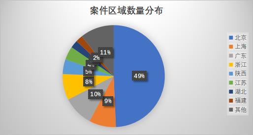 从案件地域管辖划分:北京221件、广东43、上海38件、浙江37件、江苏19件、陕西21,湖北11 福建10其他省份48;
